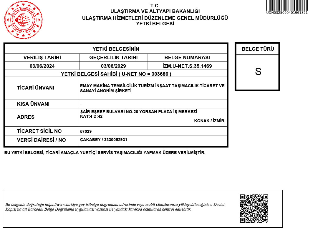 S Yetki Belgesi – EMAY, bu yetki belgesi, ticari amaçla yurt içi servis taşımacılığı